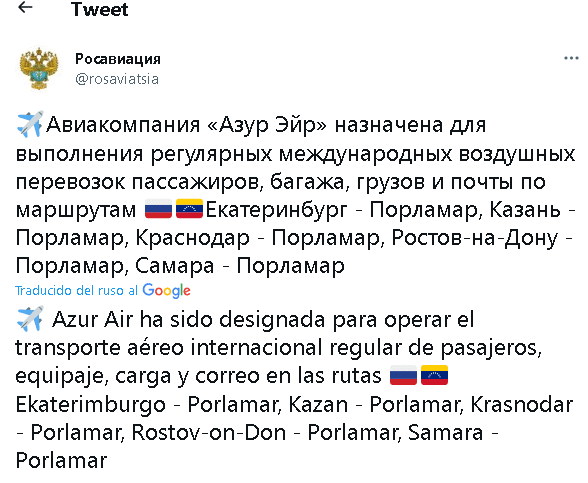Azur Air ha sido designada para operar el transporte aéreo internacional regular de pasajeros, equipaje, carga y correo en las rutas entre Rusia y Venezuela como Ekaterimburgo – Porlamar, Kazan – Porlamar, Krasnodar – Porlamar, Rostov-on-Don – Porlamar, Samara – Porlamar. Así lo dio a conocer a través de un comunicado en su cuenta de twitter oficial la Autoridad Aeronautica de Rusia.