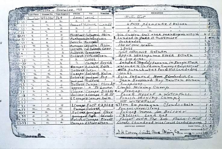 De acuerdo a una fotocopia al “Pilot Flight Record and Log Book” de Jimmie Angel, aquel vuelo del 16 o 18 de Noviembre de 1933 en el que Angel avistaría por primera vez el Salto que llevó su nombre, fue realizado en un Curtiss-Wright CW-6B Sedan matricula NC431W, c/n 6B-2038, en esencia un Travel Air 6000-B, luego de que esta fuese comprada por Curtiss-Wright. Fue uno de los 4 últimos aviones que llevaron placa de identificación Travel Air. Entre las observaciones de ese día, Angel escribió: “Me conseguí para mi una cascada”.