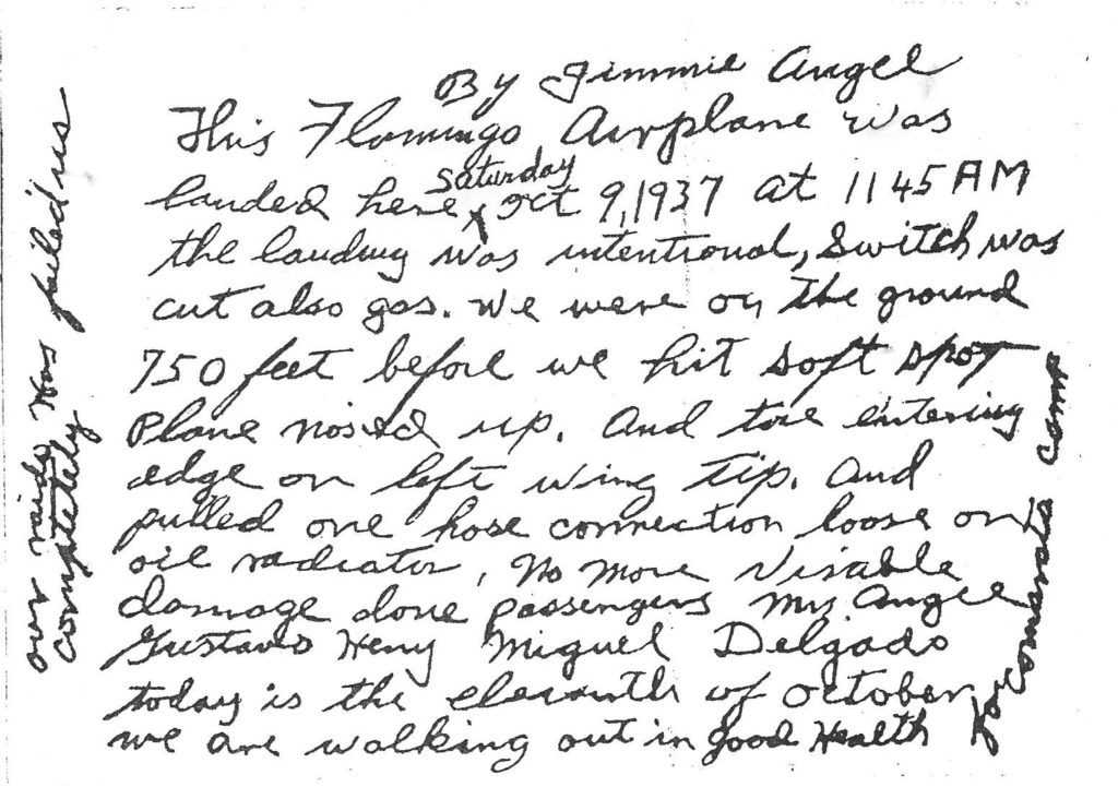 «Por Jimmie Angel. Este avión Flamingo aterrizó acá el Sábado 9 de Octubre, 1937 a las 11:45 am el aterrizaje fue intencional, el interruptor había sido cortado igual la mezcla. Rodamos por la tierra 750 pies [230 m] antes de alcanzar un punto suave capotando el avión. Y rompiendo el borde extendido en la punta de ala izquierda. Y se soltó la conexión de una manguera del radiador de aceite. No hay más daños visibles a los pasajeros la Sra. Angel, Gustavo Heny Miguel Delgado hoy es el once de Octubre estamos caminando con buena Salud al campo de Comarata (sic) nuestro radio nos falló completamente.»
