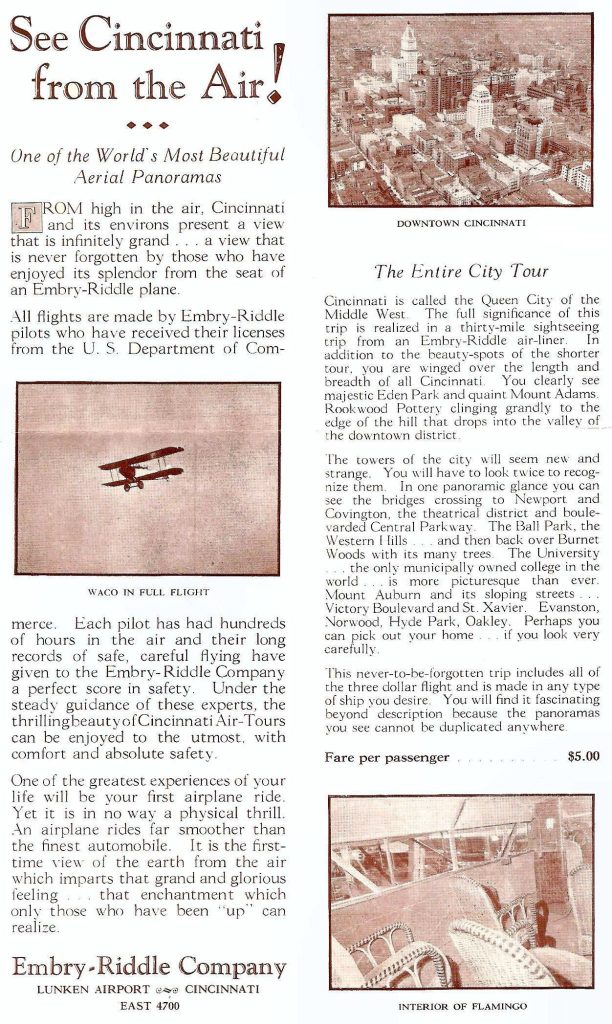 Anuncio de los tours escénicos sobre Cincinnati de Embry-Riddle. La foto muestra el interior del Metal Flamingo.