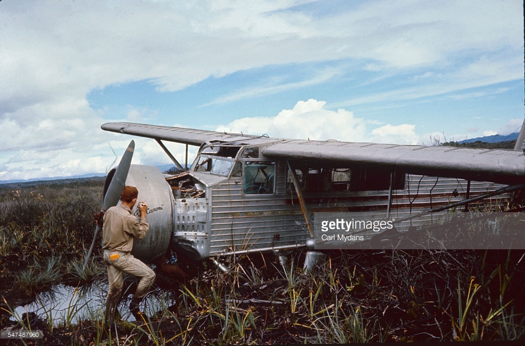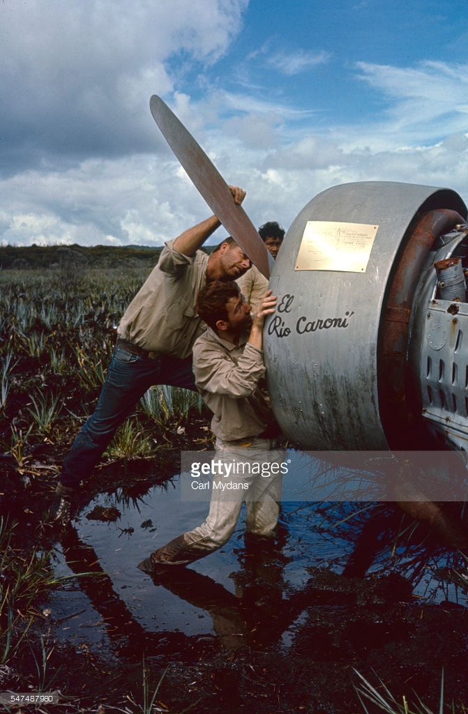 Rolan Angel repinta el nombre “El Río Caroní” en capó del Monoplano Flamingo de su padre en un pantano, en el Auyantepuy, Venezuela. Foto Carl Mydans 1965.