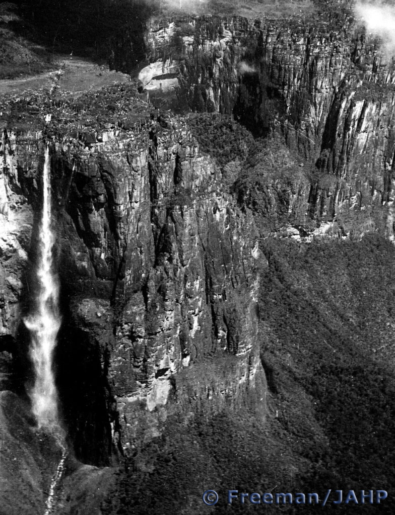 Fotografía de Tom Dickey trabajador de la Creole, sobrevolando Canaima. Se aprecia la figura del avión de Jimmy Angel. Año 1954.